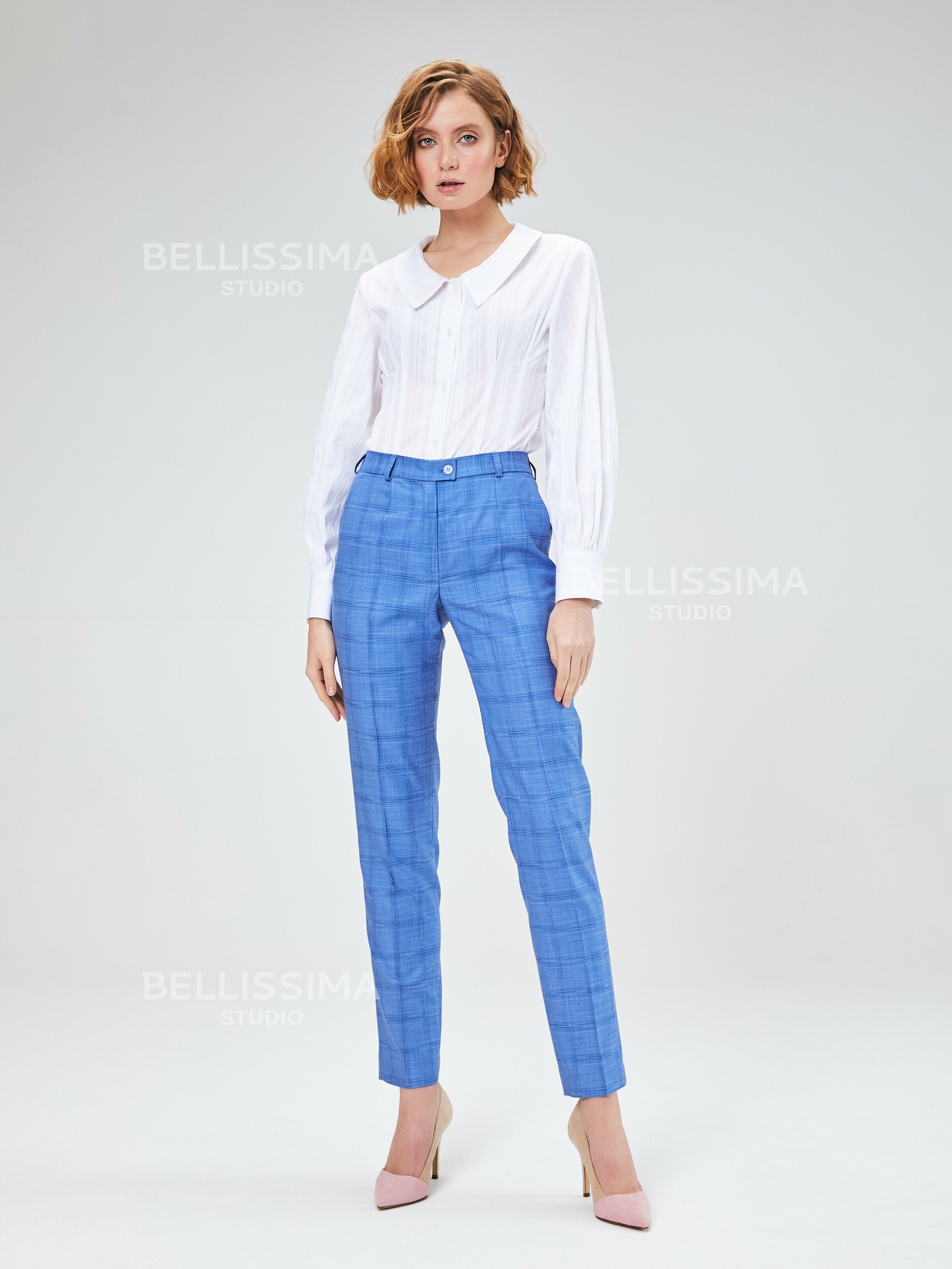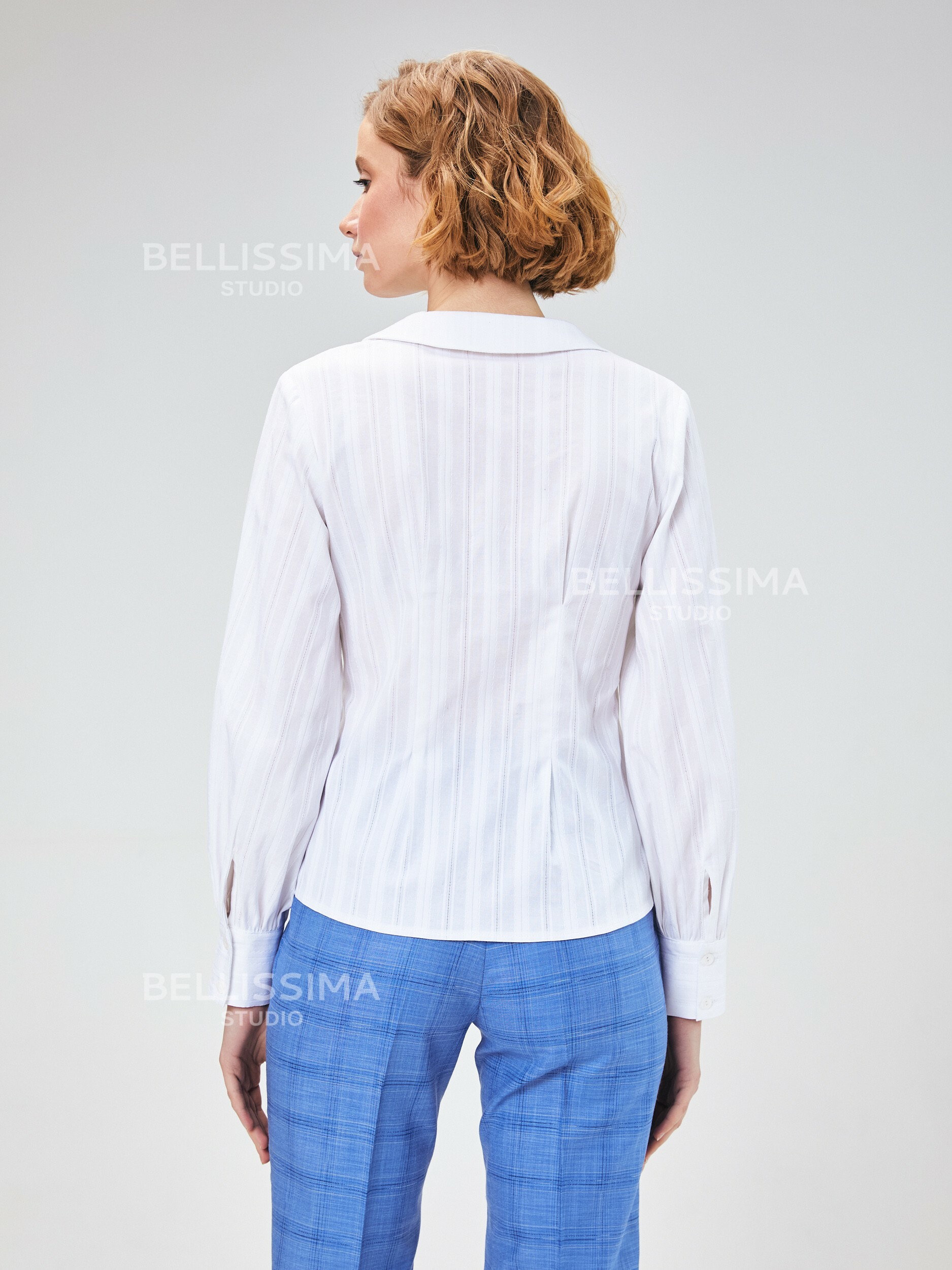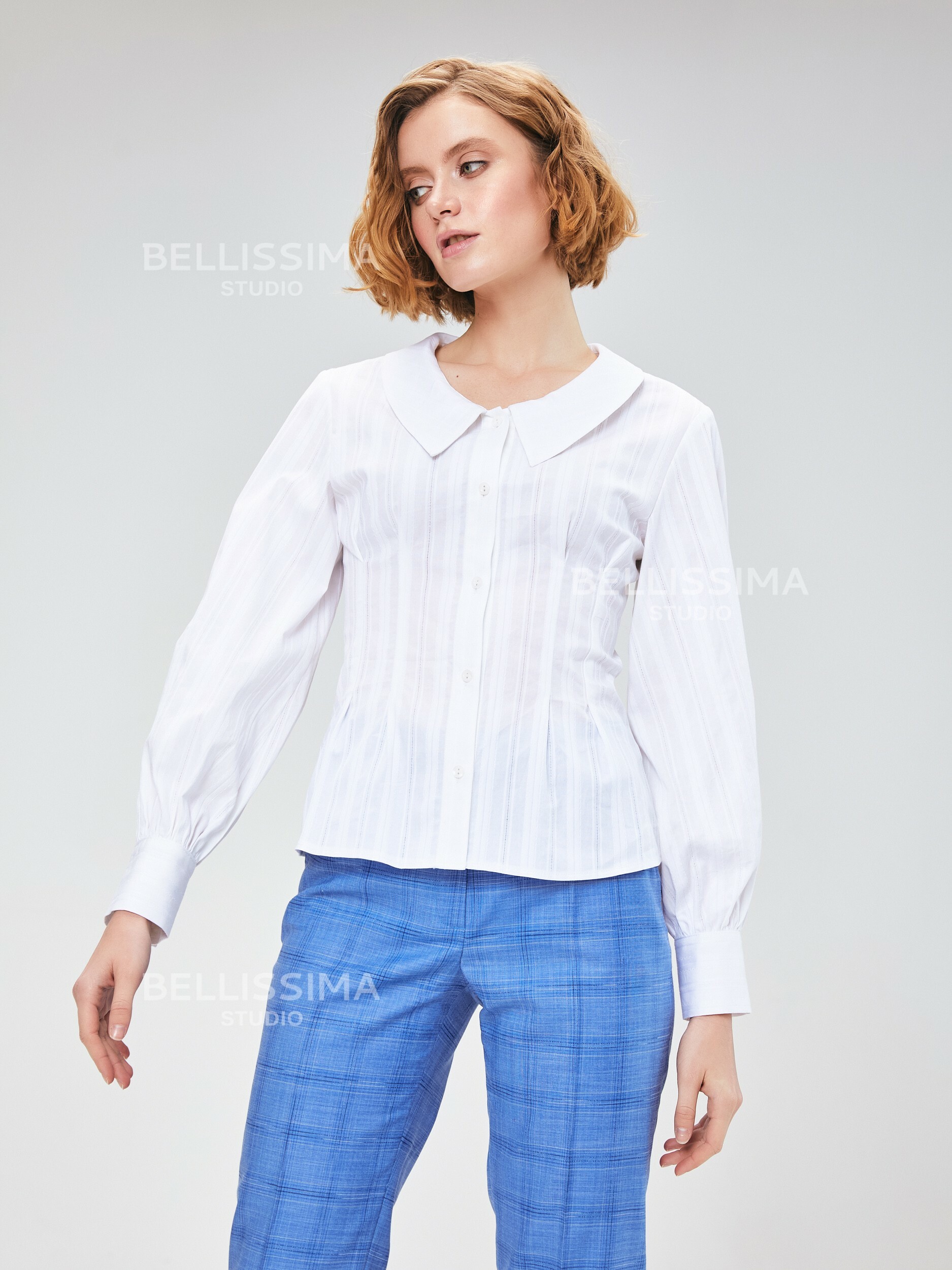 Блузка выполнена из фактурного хлопка с отложным воротником и круглым вырезом, длинные объемные рукава с напуском, на манжете. – манжет застегивается на 2 пуговицы;- приталенный крой;- застежка по переду на пуговицах.