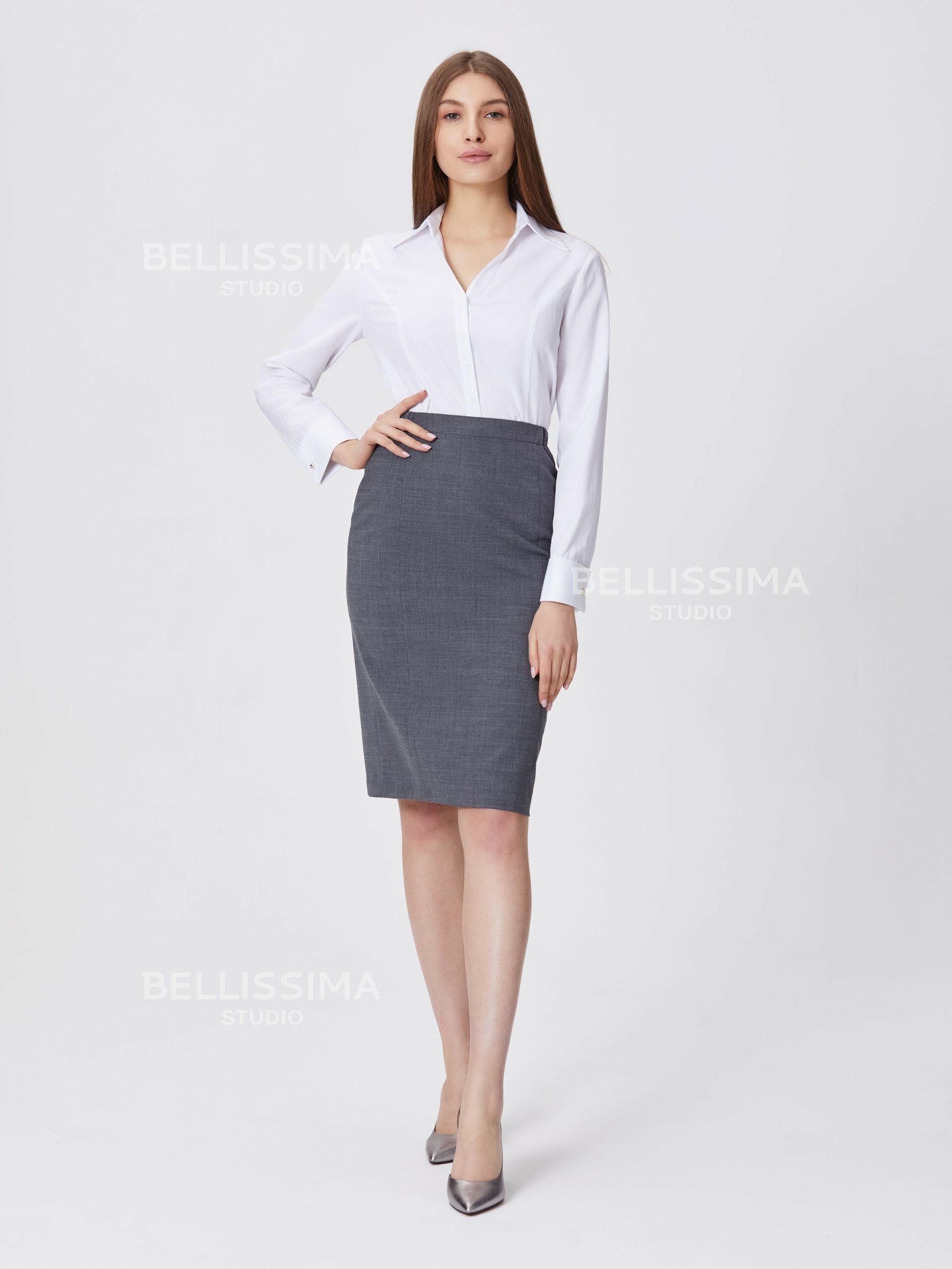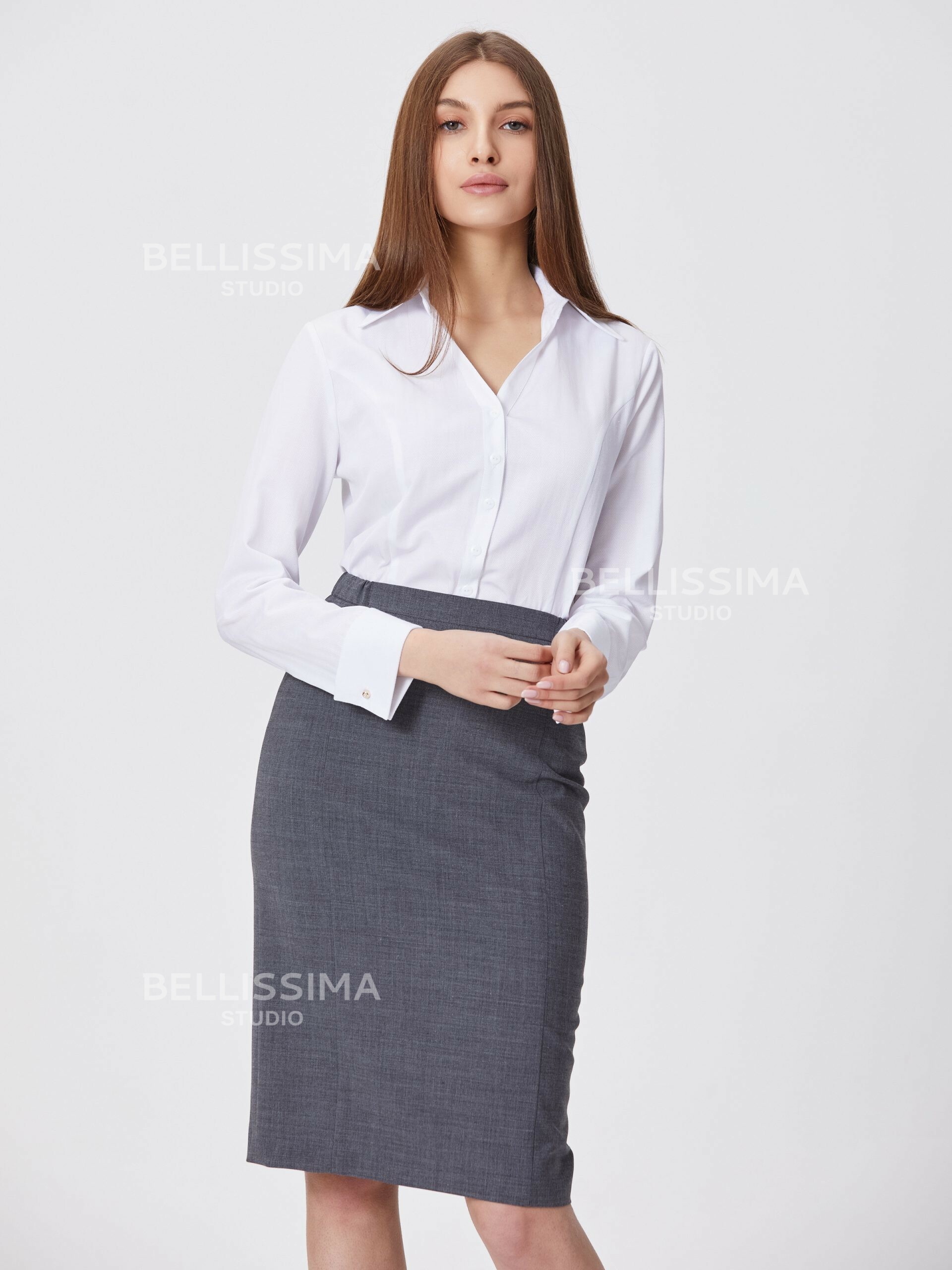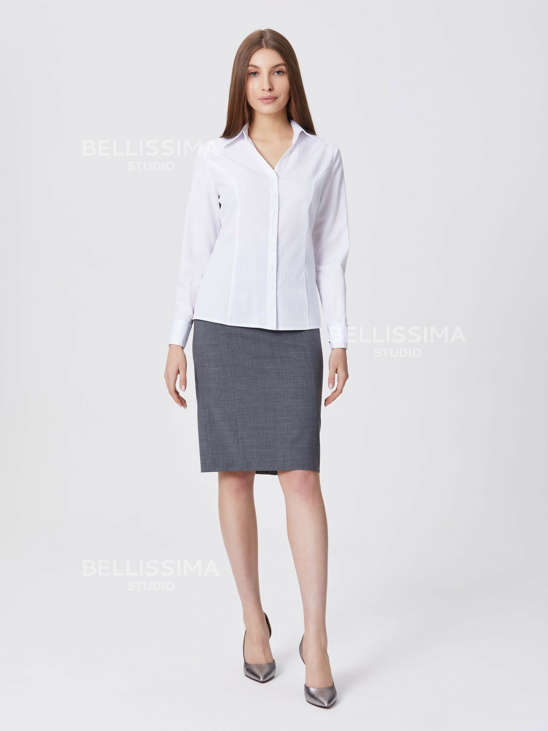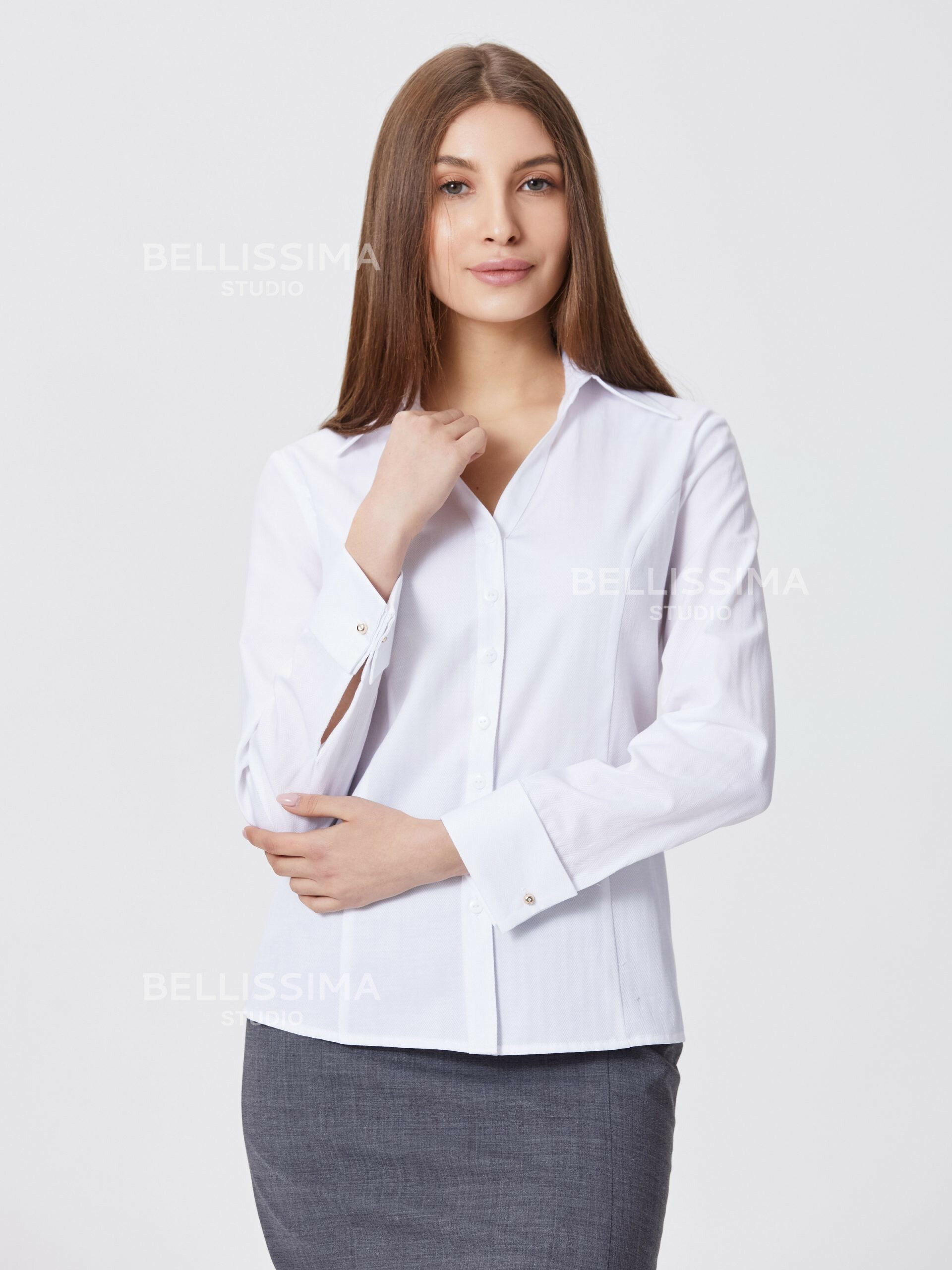 Классическая блуза полуприлегающего силуэта выполнена из хлопковой ткани, с длинными рукавами на манжете. – сорочечный воротник на отрезной стойке;- застежка по переду на пуговицах.