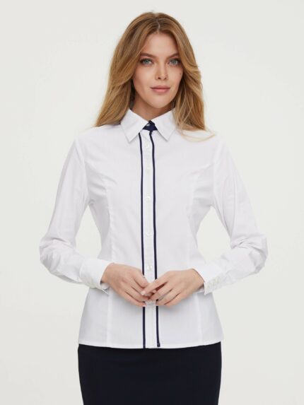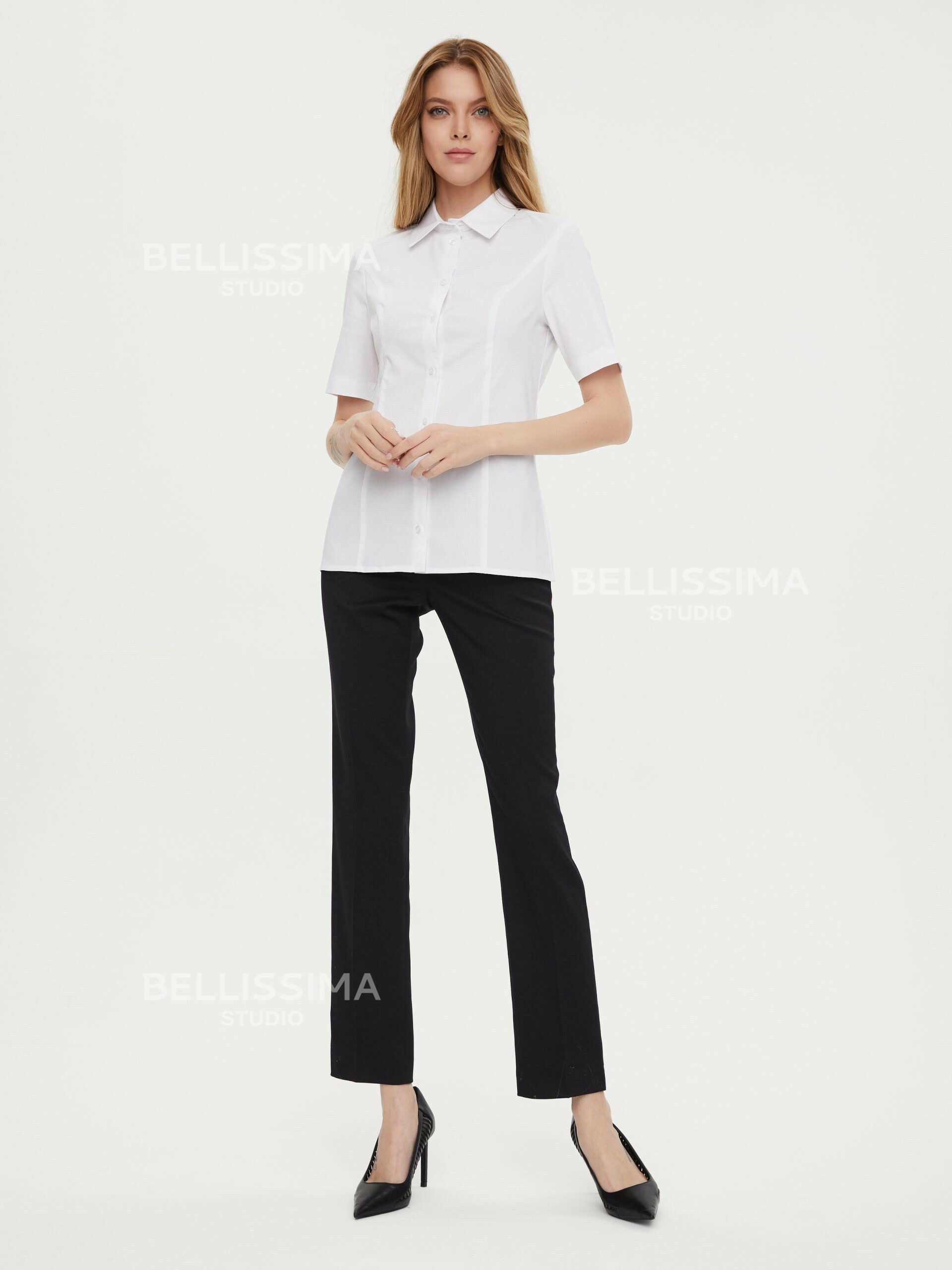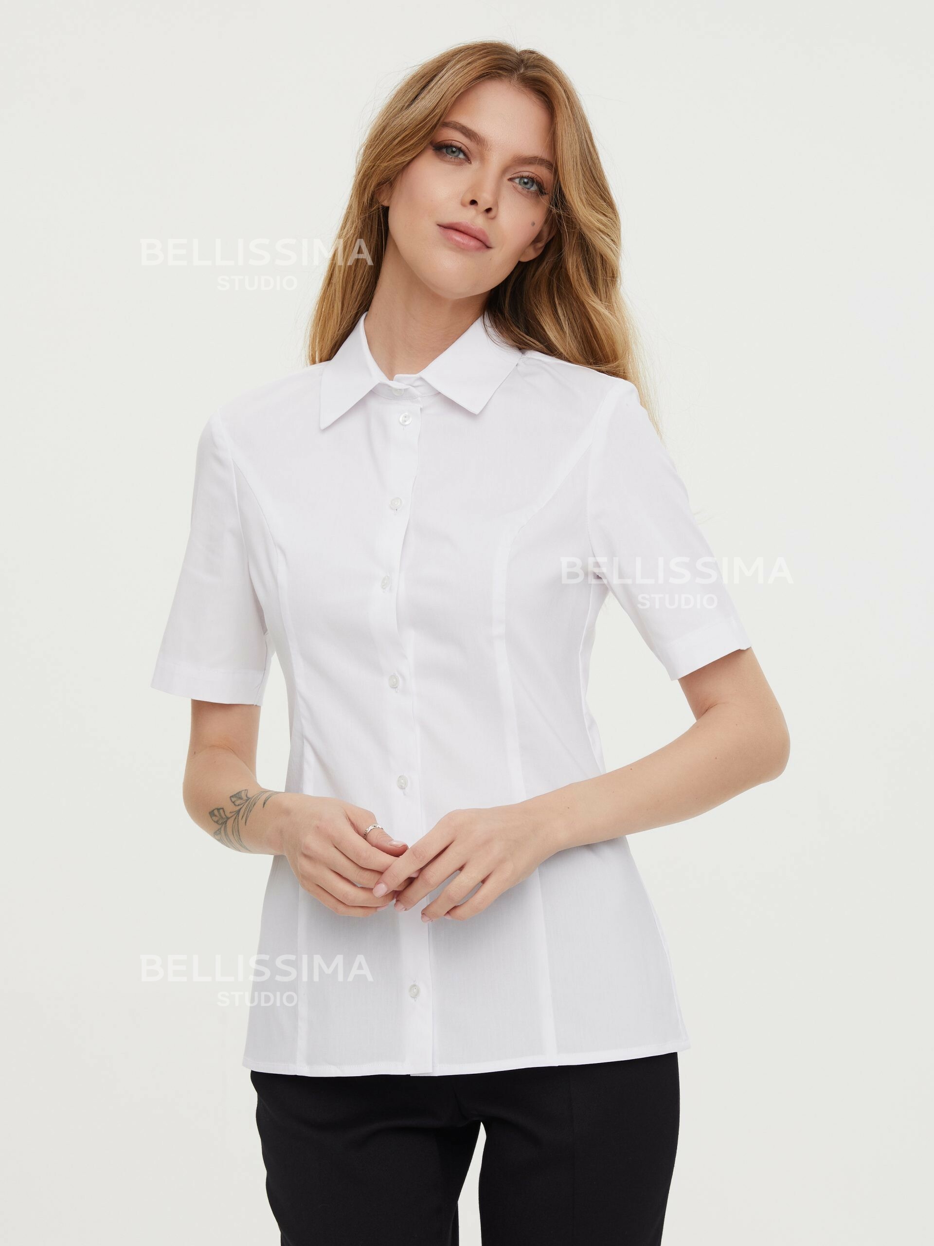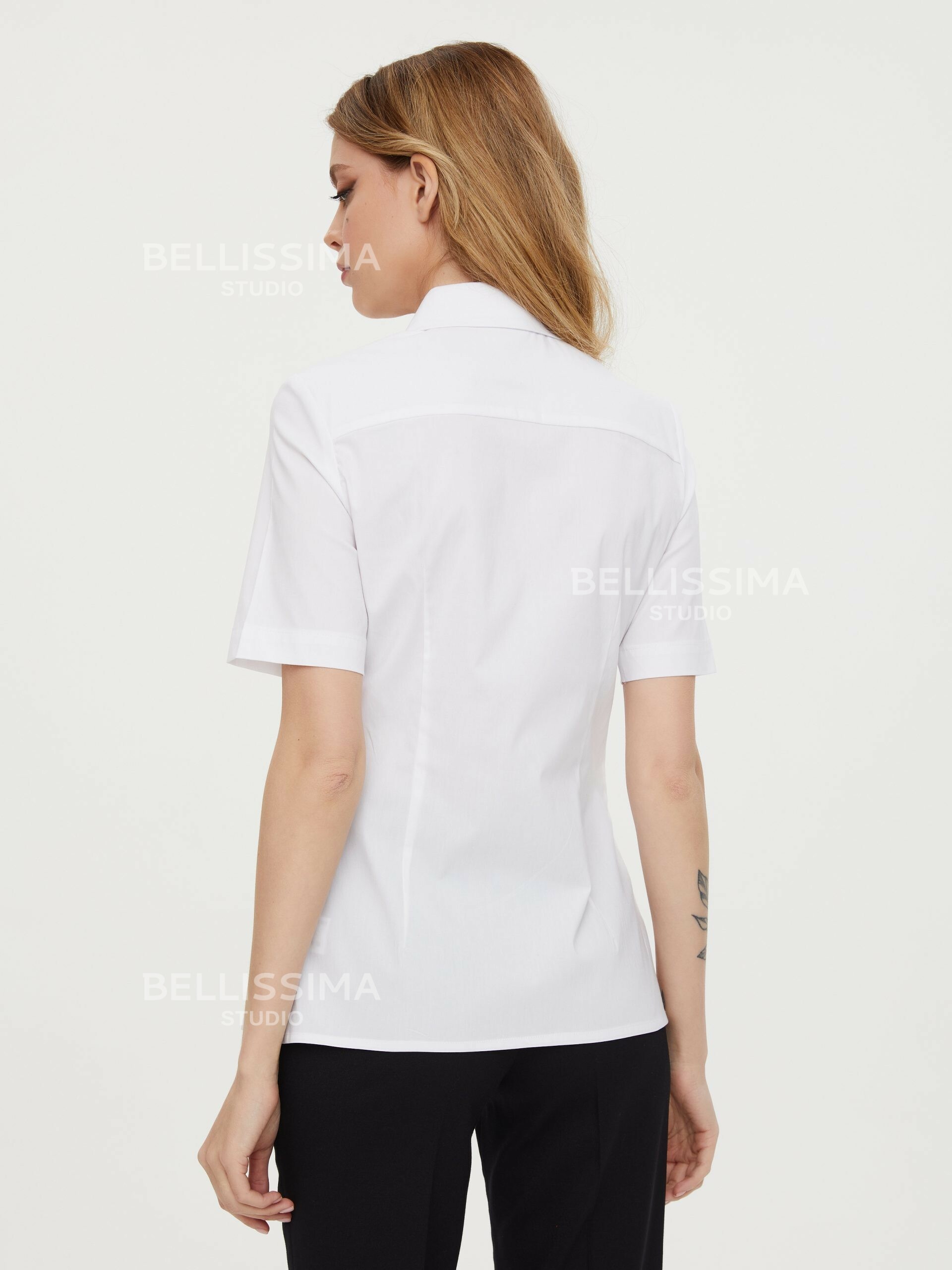 Классическая блуза полуприлегающего силуэта выполнена из хлопковой ткани, с короткими рукавами на манжете. – Сорочечный воротник на отрезной стойке – Застежка по переду на пуговицах.