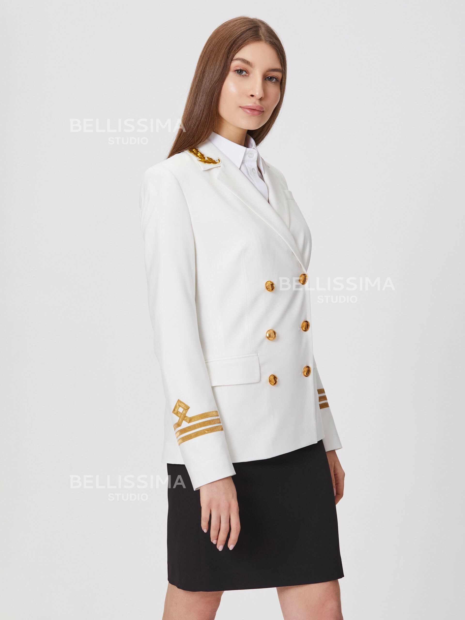 Китель форменный из шерстяной ткани белого цвета, полуприлегающего силуэта, на подкладке и юбка черная прямого силуэта. – двубортная застежка на три форменные пуговицы;