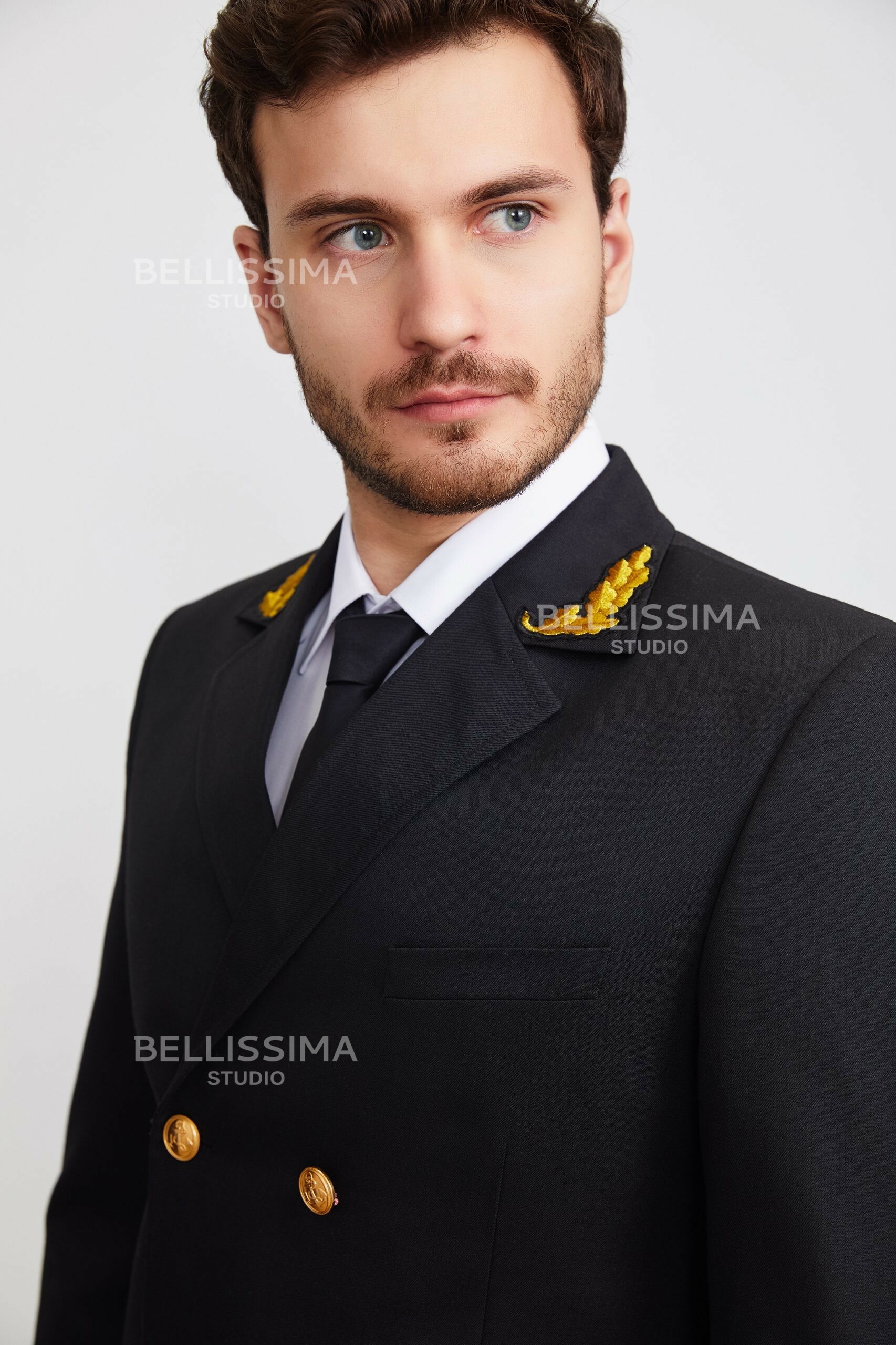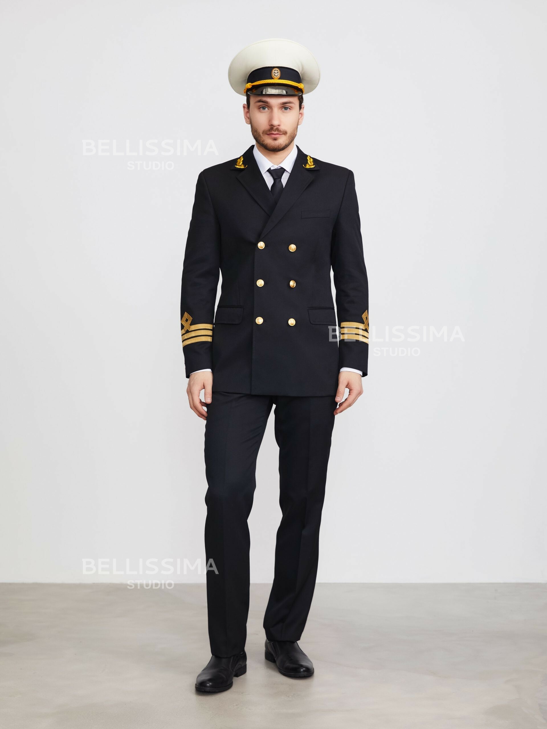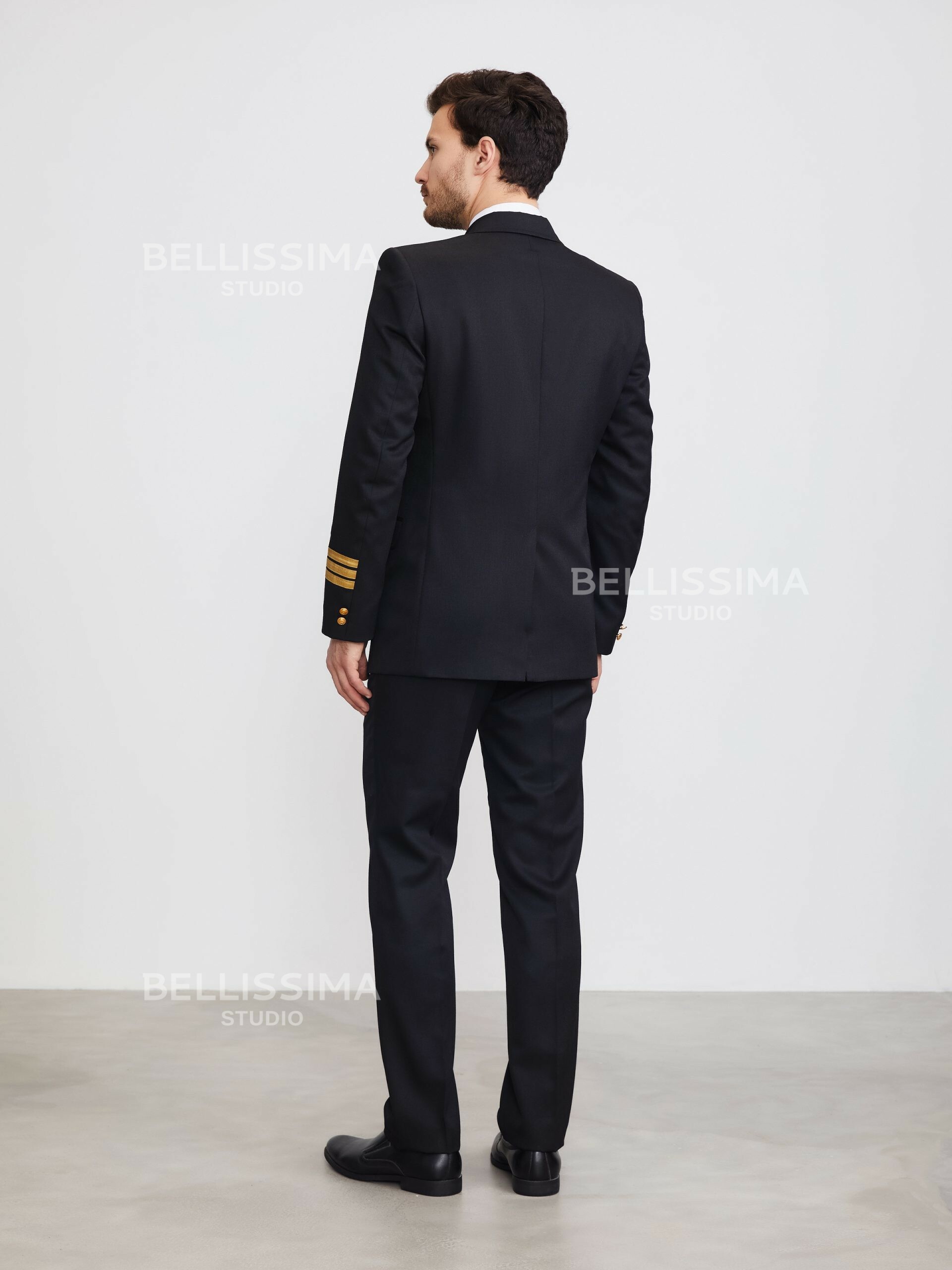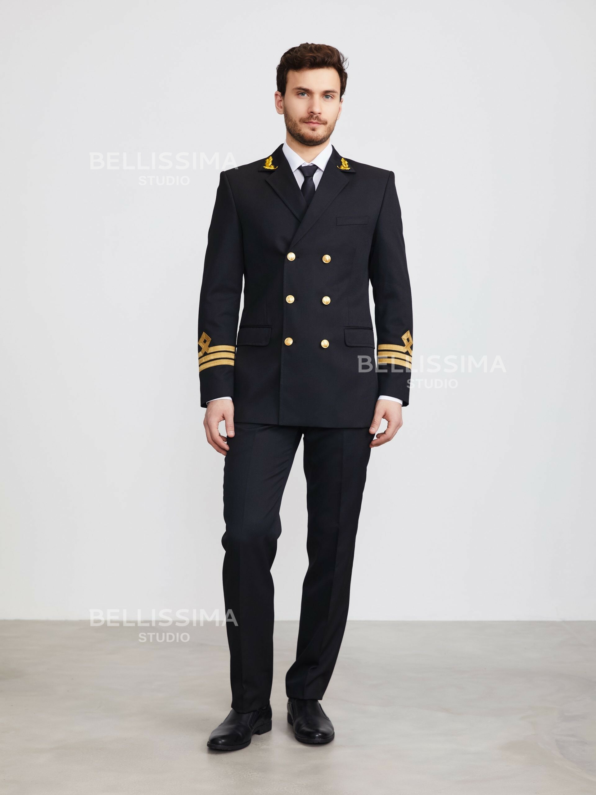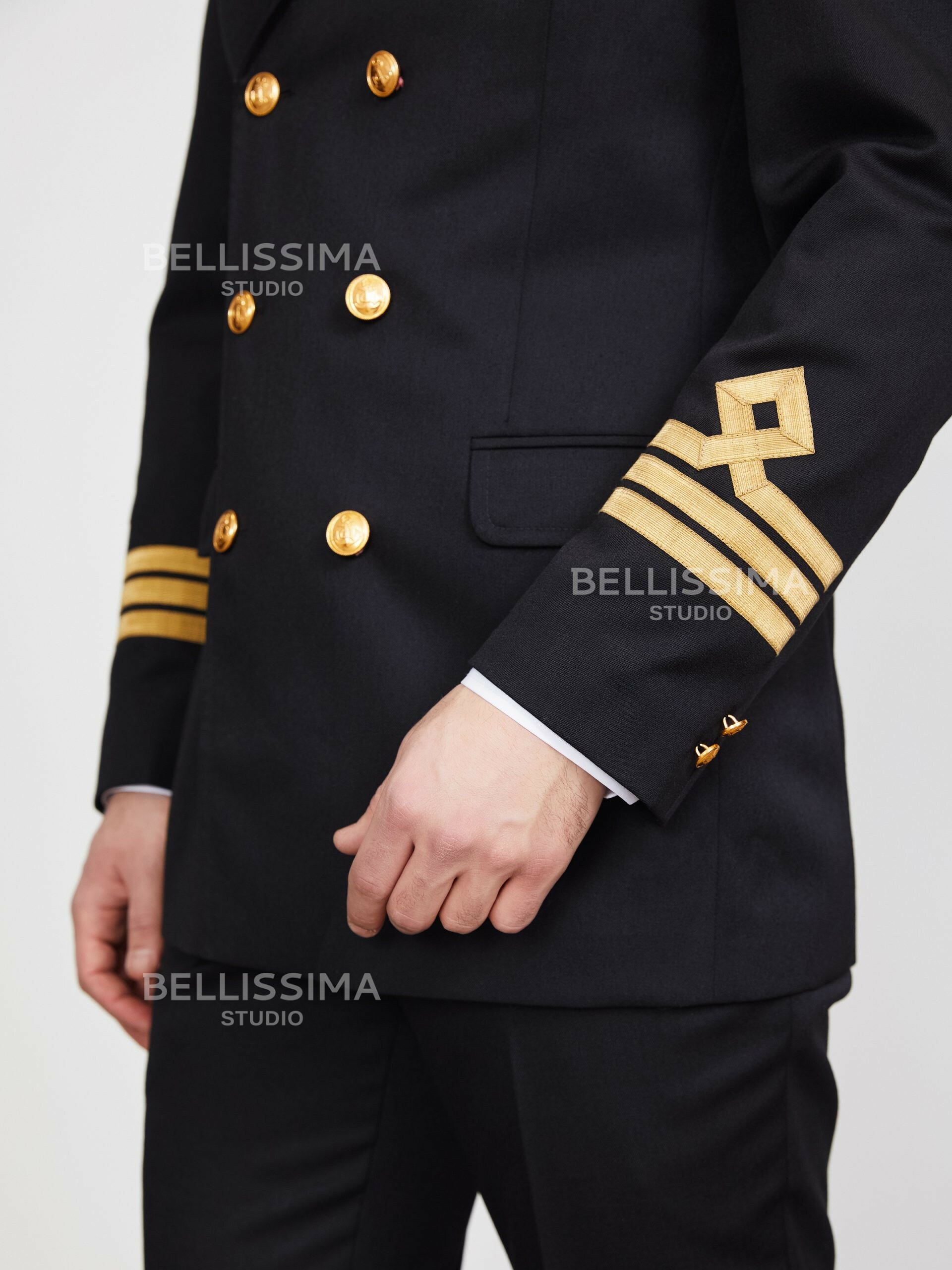 – двубортная застежка на три форменные морские пуговицы;