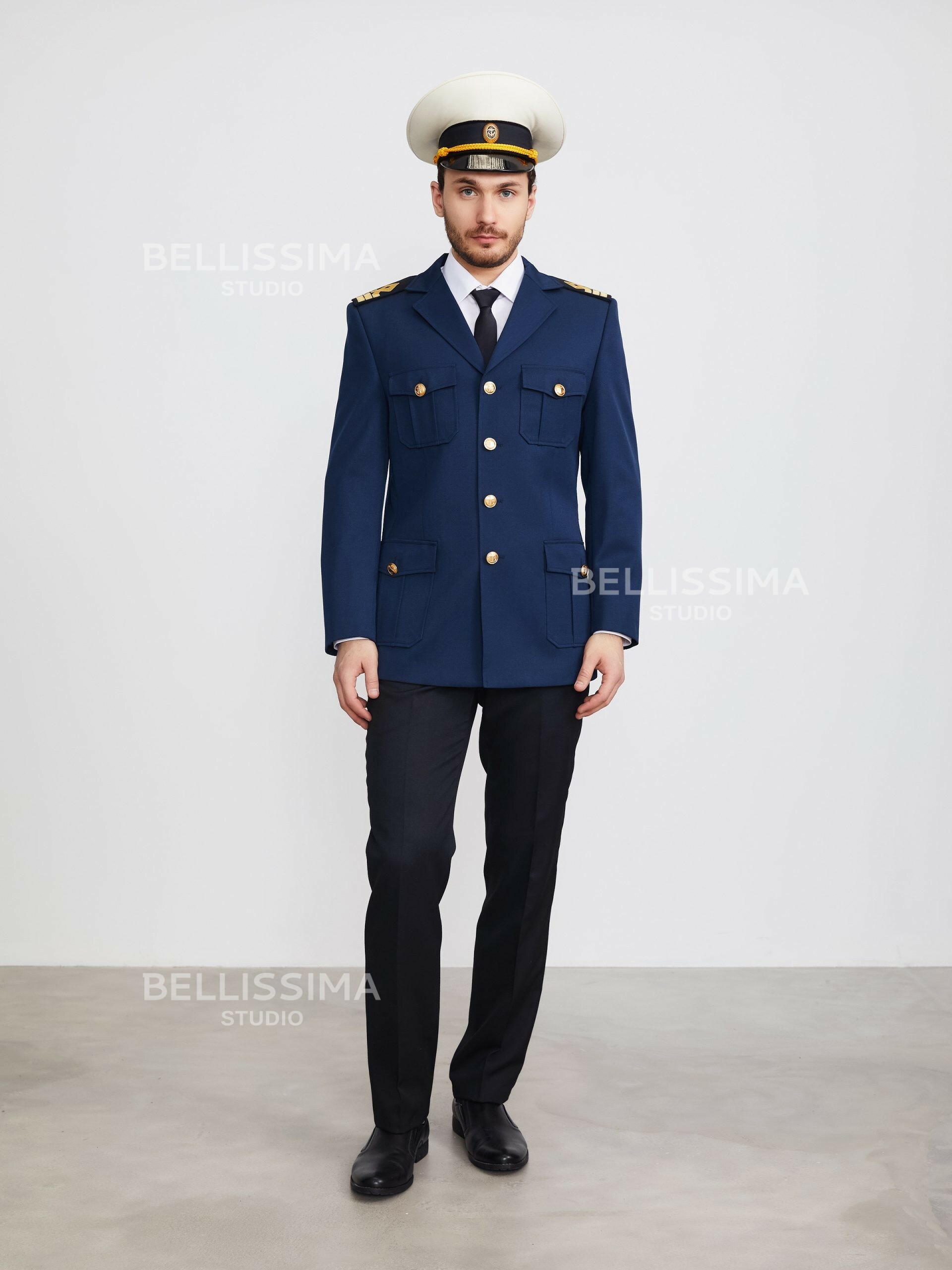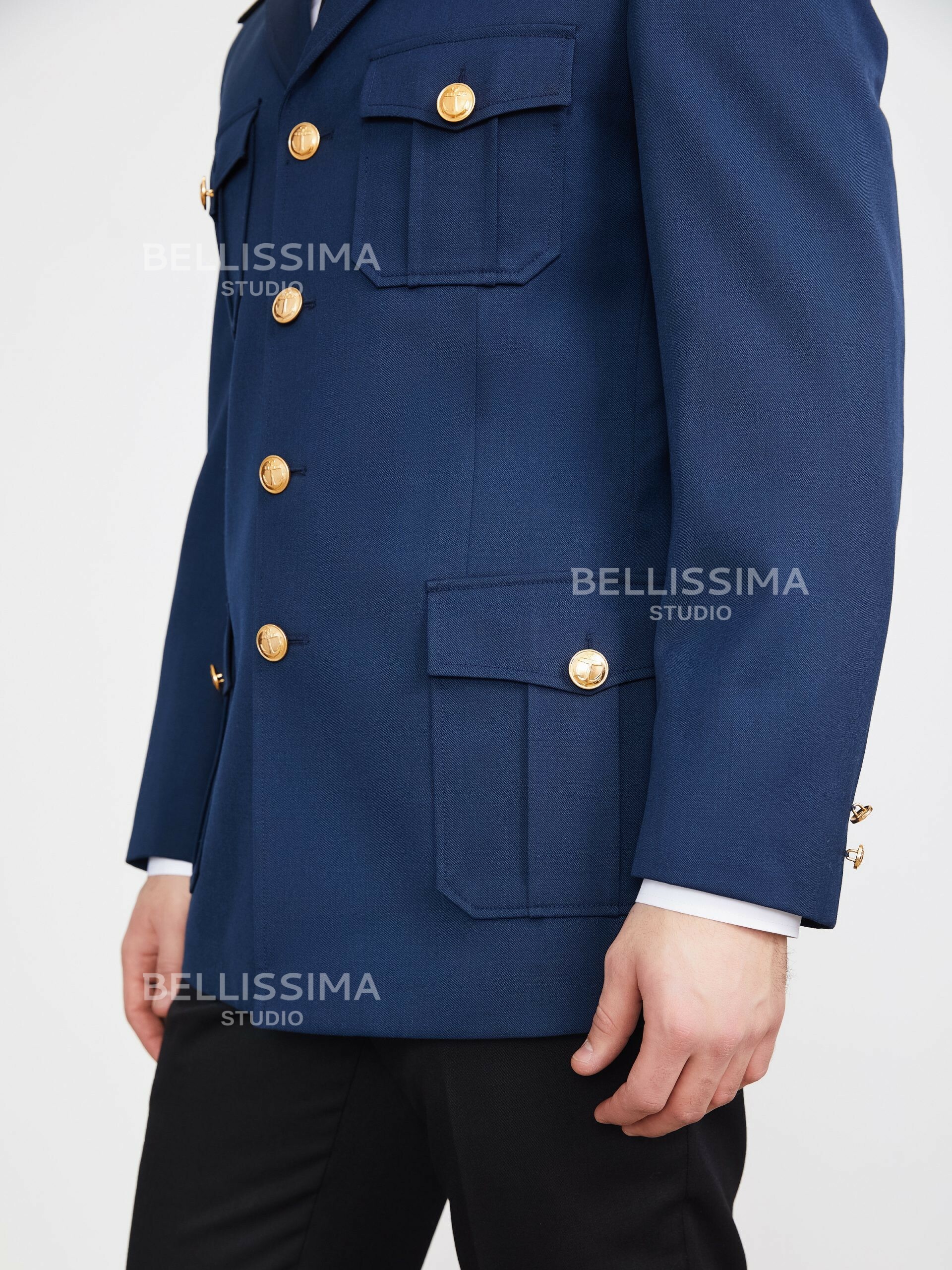 – четыре накладных кармана с бантовой складкой посередине, на подкладке, с фигурными клапанами, застегивающимися на форменную морскую пуговицу;