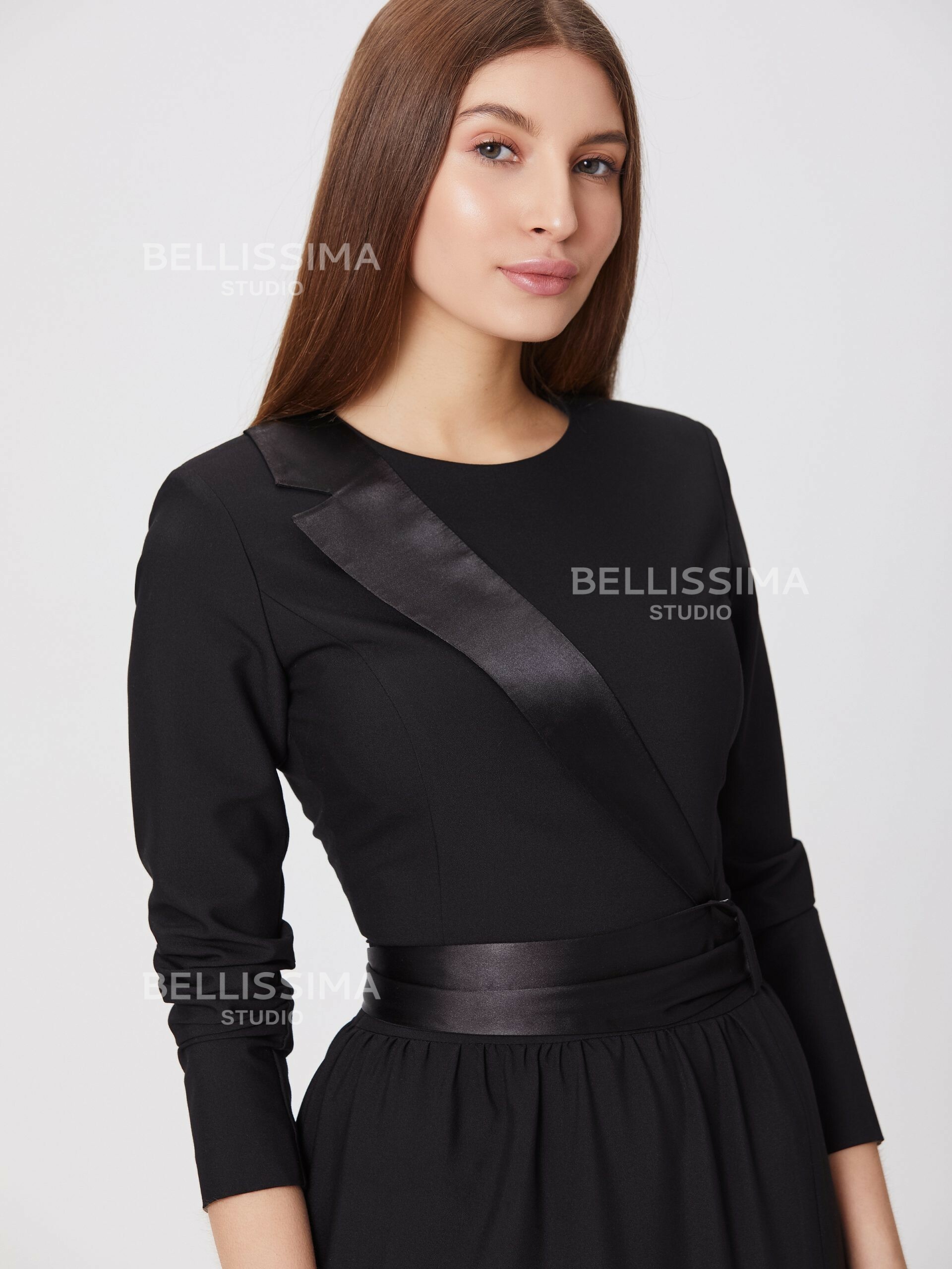 Платье из мягкой ткани с атласным воротником и поясом. Атласный пояс подчеркивает талию.- застежка на молнию;- рукава длинные;- без подкладки.В этом платье вы получаете готовый образ, который отлично смотрится, и является универсальным нарядом на все случаи жизни.