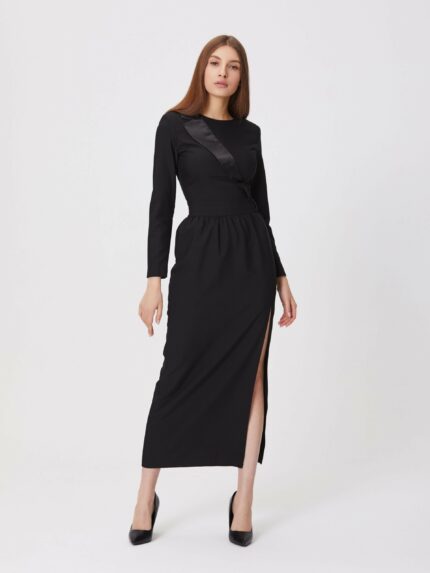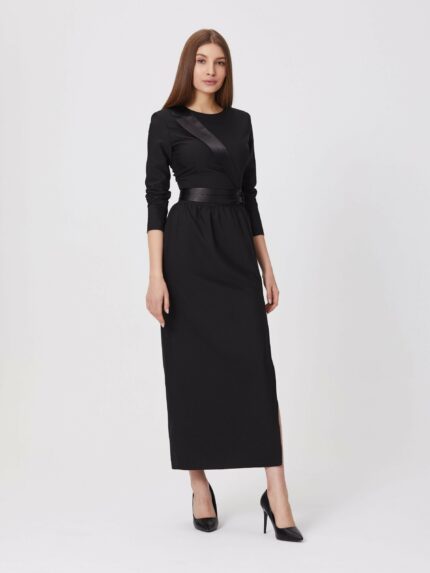 Платье прямого силуэта с V-образным вырезом и разрезами по бокам, длина ниже колена выполнено из эластичной, средней плотности костюмной ткани.