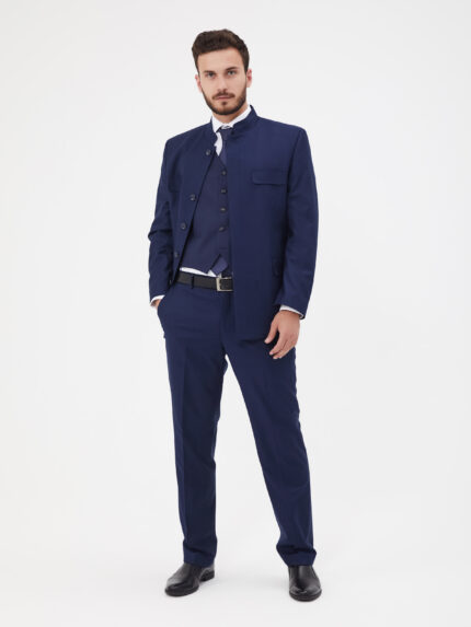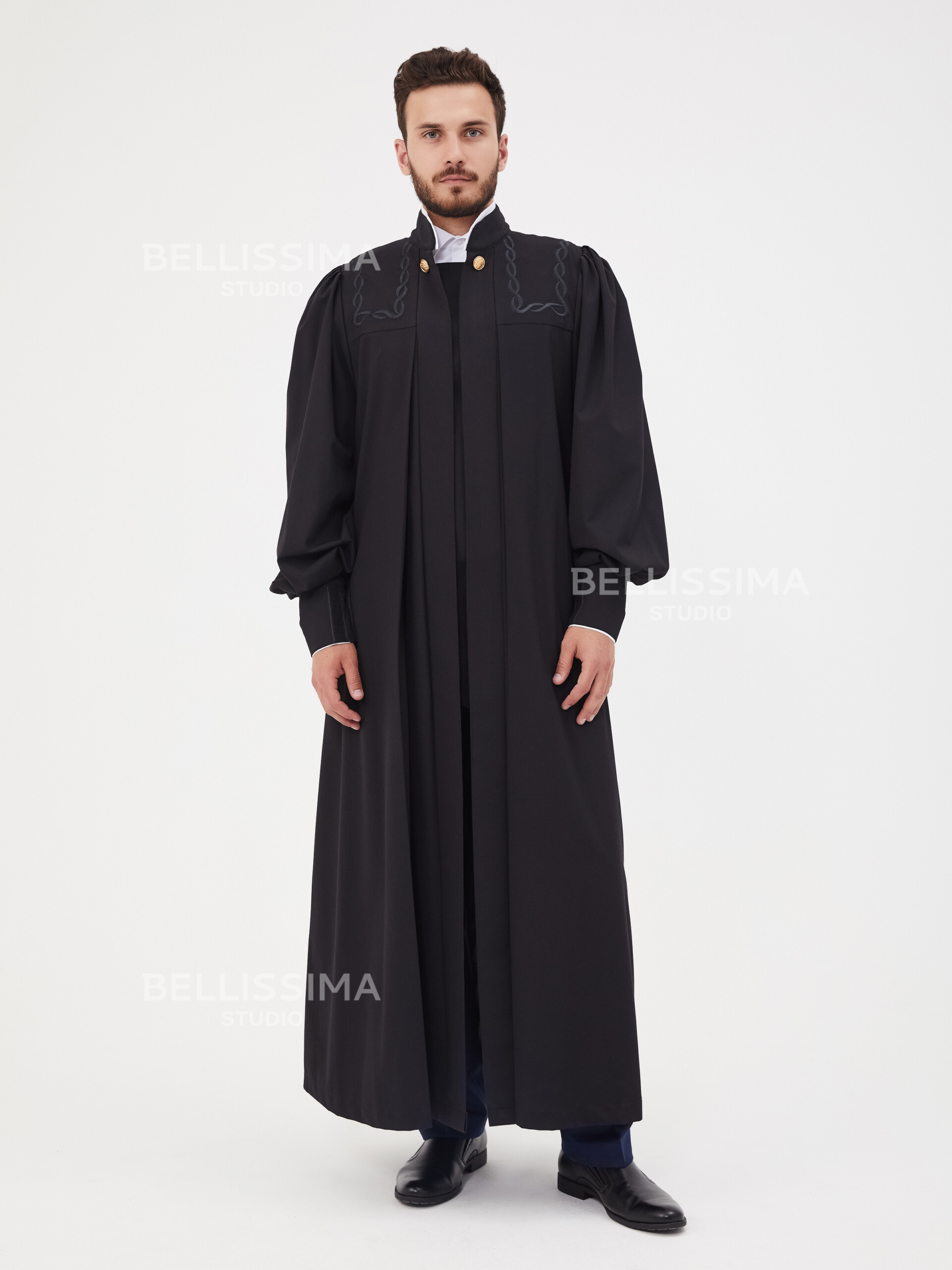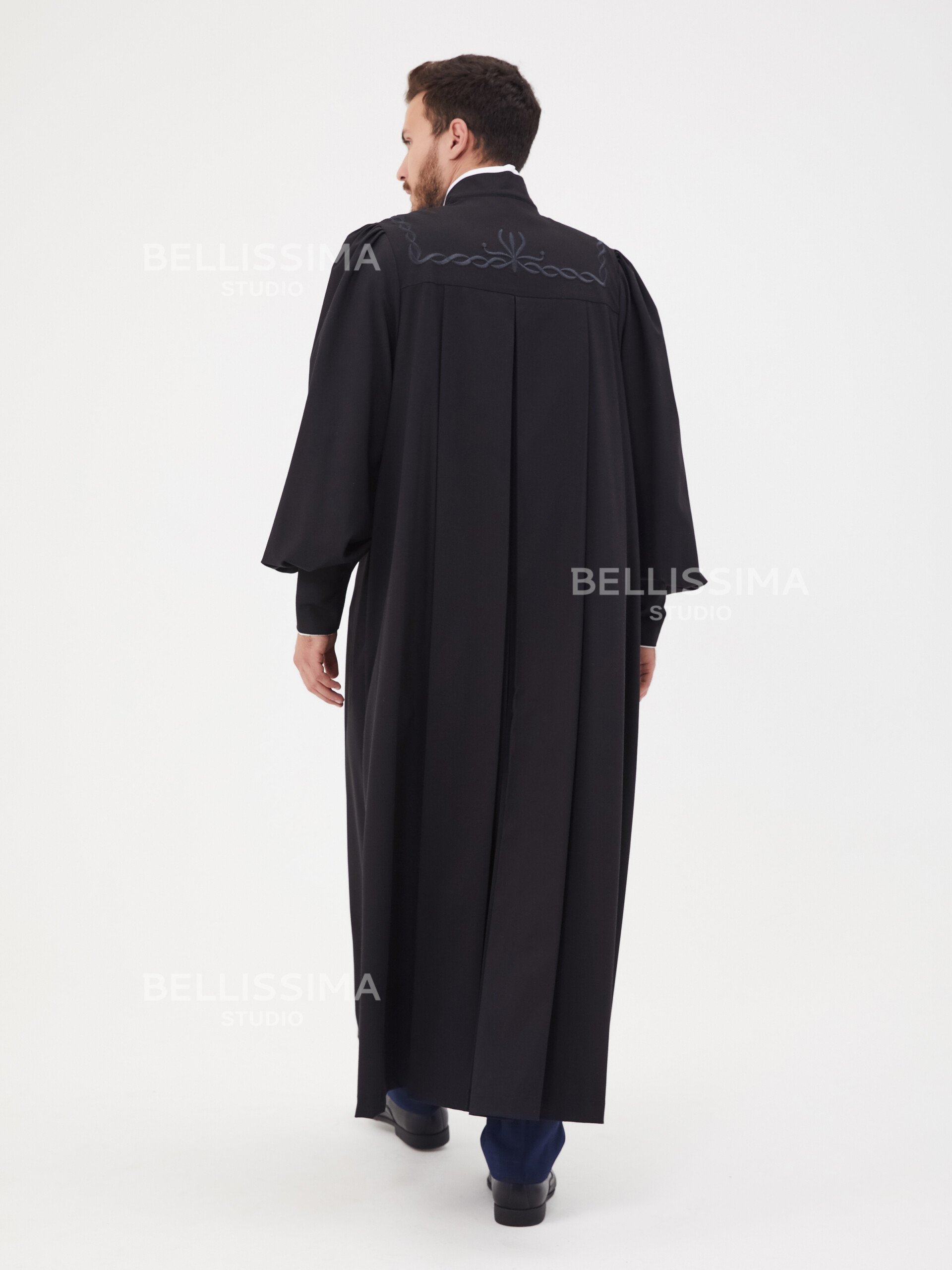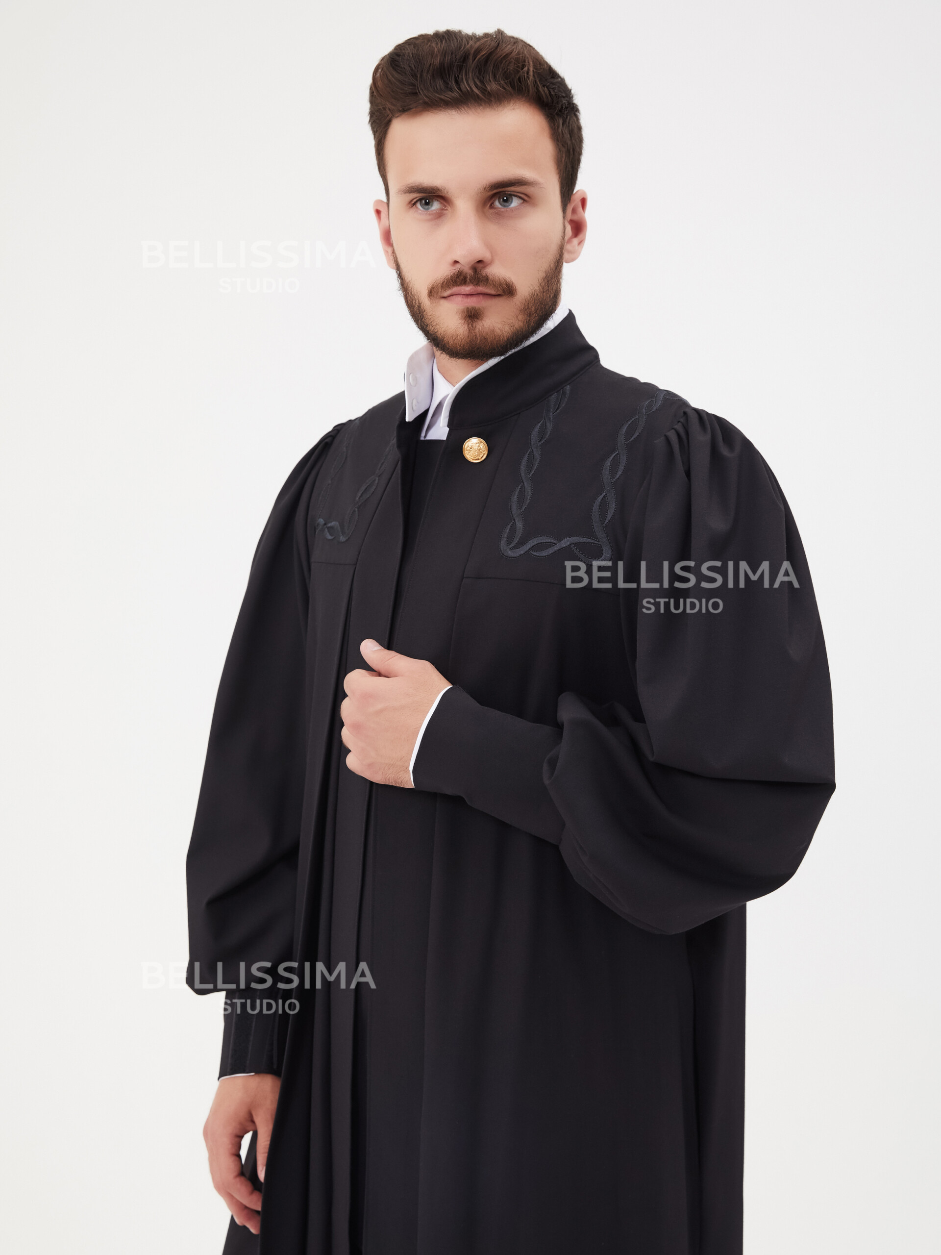 Судебная мантия мужская.Без подкладки, из высококачественной не мнущейся тонкой  ткани черного цвета. Силуэт трапеция с большой прибавкой на объем. Длина доходит до каблука туфель, расстояние от пола три-четыре см. Центральная бортовая застежка в стык на застежку «Молния» на притачном пластроне с внутренней стороны. Полочки и спинка на двойной отрезной кокетке цельновыкроенной, без плечевых швов, со сплошной вышивкой, переходящей на спинку (20 завитков, 8-ми конечный узор, 20 завитков) , притачной двойной планке от горловины, с глубокой односторонней складкой от угла кокетки в сторону полузаноса. По сгибу складки  проложена отделочная строчка, шириной шва 0,1-0,2 см. Карманы в боковом шве.