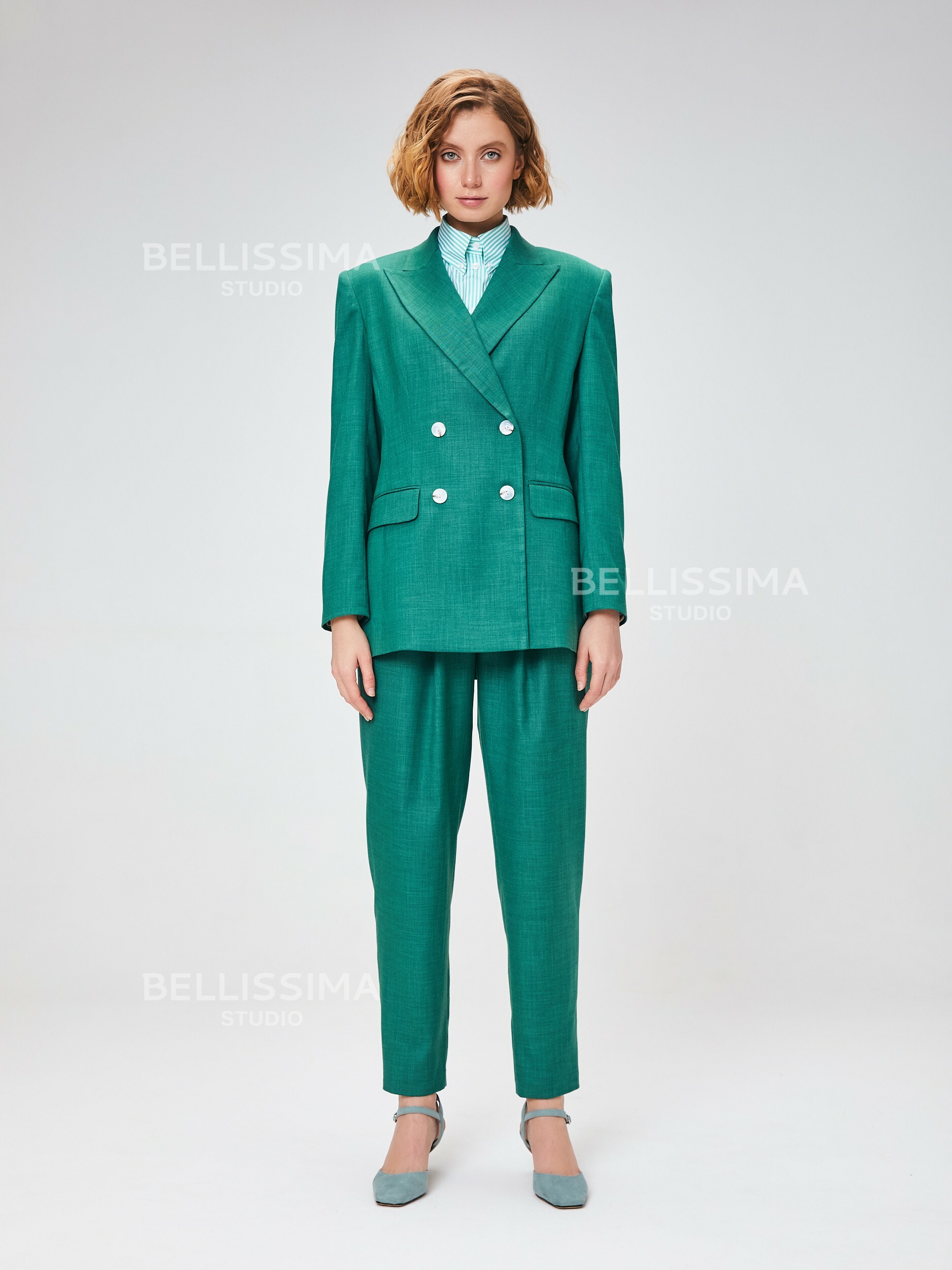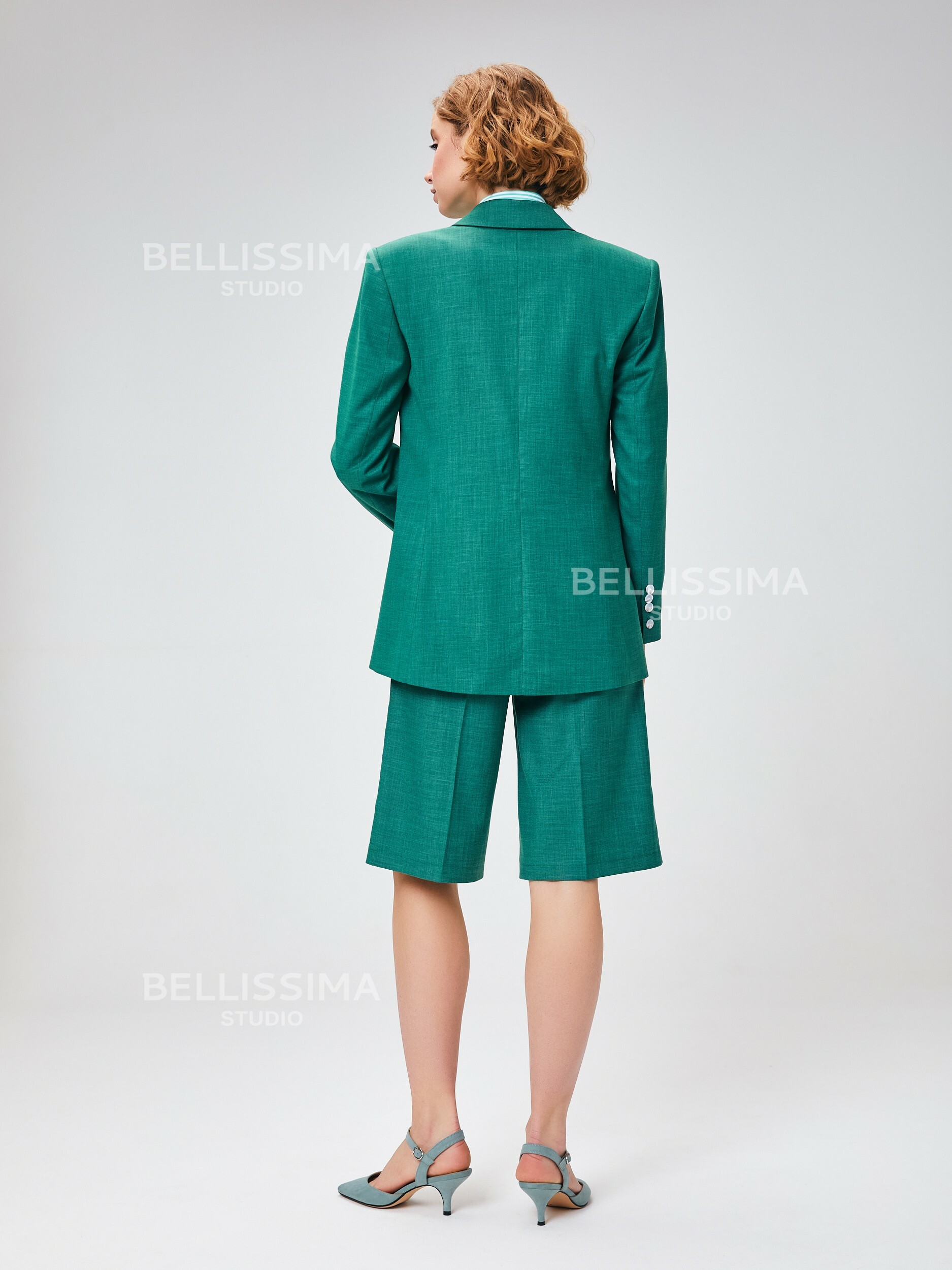 Жакет прямого силуэта. Выполнен из эластичной, средней плотности костюмной ткани. Широкие плечи этого жакета роднят его с мужским пиджаком и позволяют носить на водолазки и джемперы.