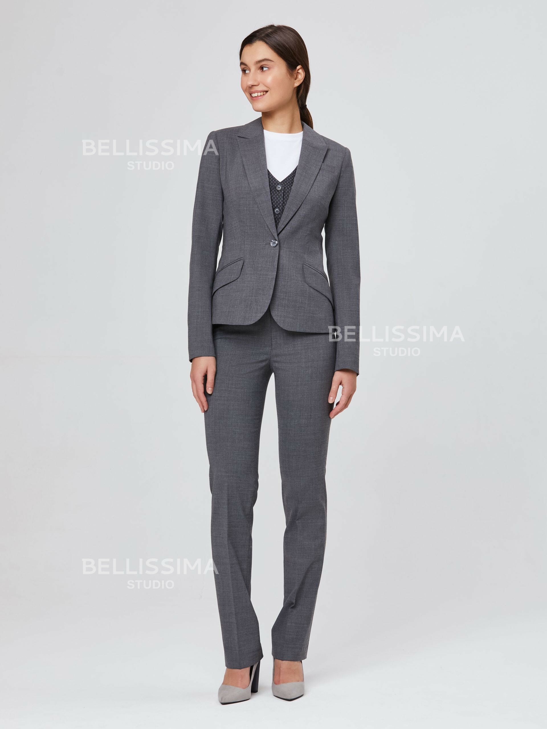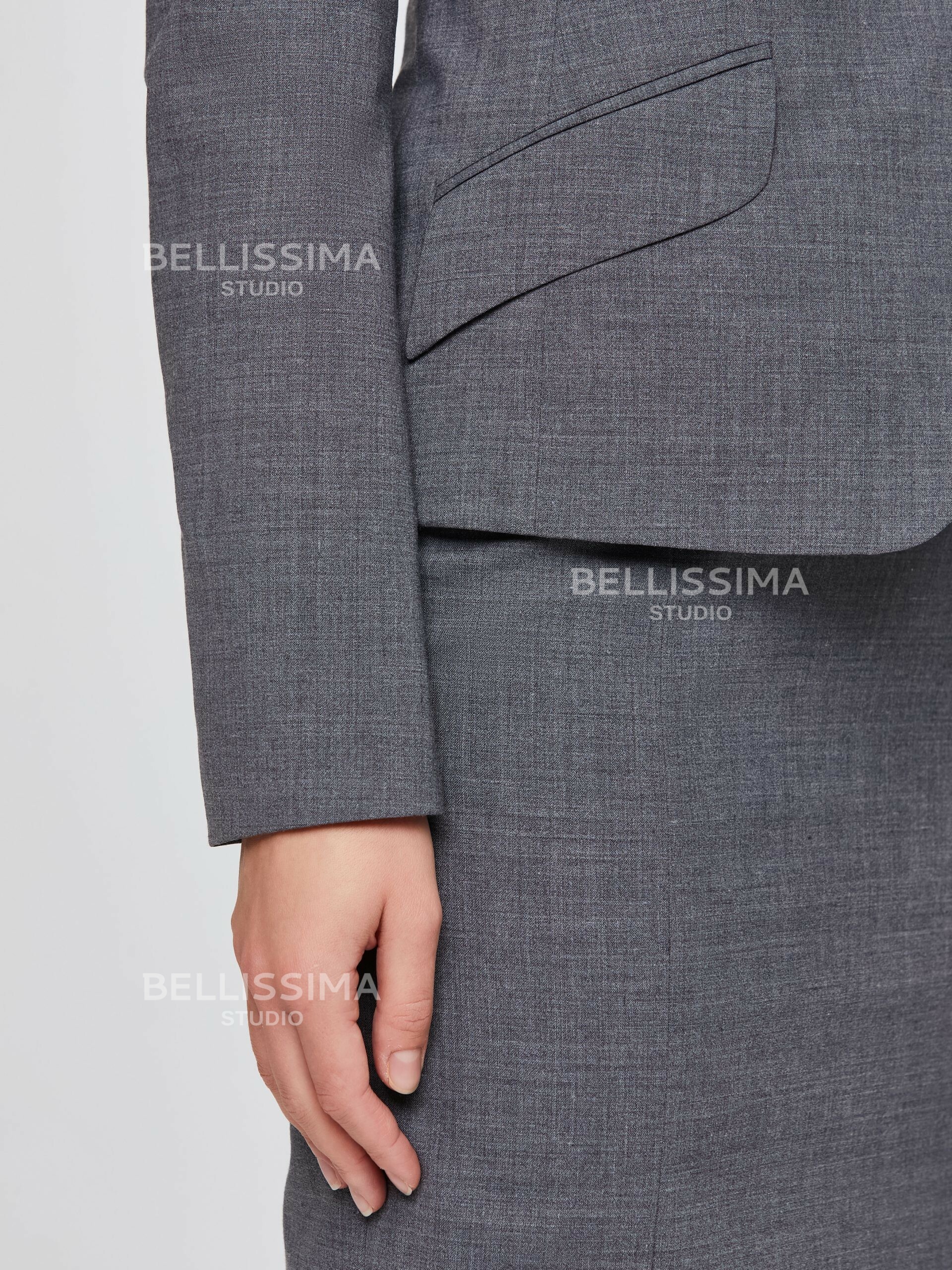 В комплекте с жакетом идет классическая юбка карандаш, зауженная к низу, а также платье.